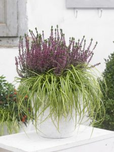 Mooie, symmetrische bloemen, stevig groen en een iets verweerde uitstraling: niets geeft de nazomer zoveel kleur en structuur als struikheide. Struikheide bloeit op zijn mooist in september en oktober en doet het geweldig als ‘groen tapijt’ in heidegebieden, vandaar ook zijn naam. De plant staat ook wel bekend als Calluna en doet het niet alleen goed in de volle grond, maar ook in potten. Struikheide combineert erg fraai met grassen, zoals je op de foto hierboven kunt zien.