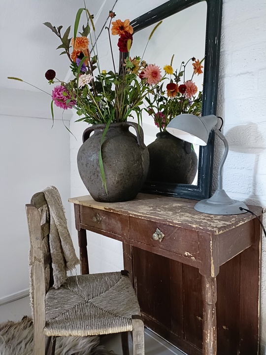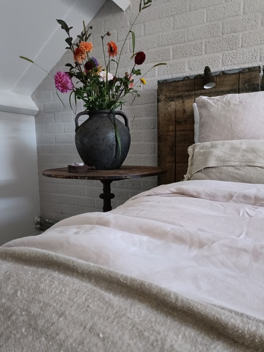 Ik heb deze prachtige pot, ook te koop bij Bloembinderij Lindhout, naast mijn bed gezet, zodat ik, zodra ik mijn ogen open, blij wakker wordt Ik heb wel een extra vaasje in de pot geplaatst, omdat het aardwerk poreus en waterdoorlatend is.