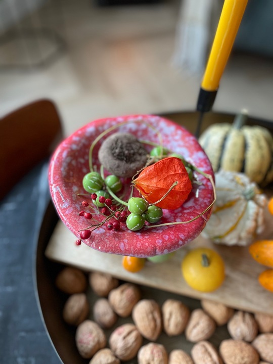 Bij ons in de straat verkoopt iemand sierpompoenen, hier ben ik met mijn kinderen heen gewandeld en heb ik ze wat leuke pompoenen laten uitkiezen. Samen hebben we ze met wat walnoten in een grote gouden schaal gedaan en het paddenstoeltje van Des Pots er bij in gezet. Hadden we gelijk een leuke activiteit om de herfst mee in te luiden!![]()