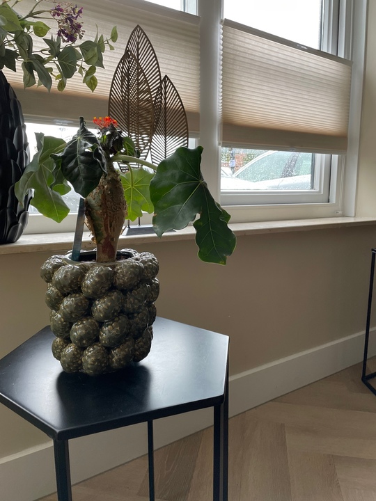 Daarnaast hebben we een flessenplant ook in een herfstige pot van Des Pots neergezet. De pot heeft een design wat kenmerkend is voor Des Pots, namelijk vol ‘geplakt’ met een bepaald voorwerp, in dit geval dennenappels!