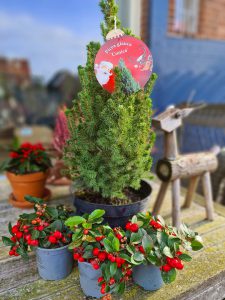 De Picea Conica is winterhard en dus eigenlijk een boompje voor het leven, dat je ieder jaar opnieuw kunt gebruiken. Wanneer ze in pot staat, vraagt ze wel regelmatig wat water. Hetzelfde geldt voor de Gaultheria. Beide willen ze na enkele weken binnen staan wel echt weer naar buiten, want daar wonen ze nu eenmaal…