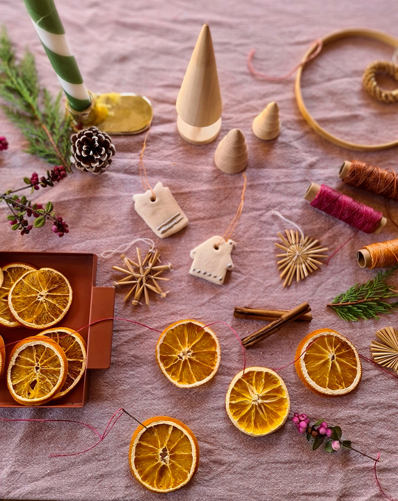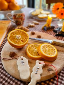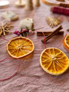 Speciaal voor het Sinterklaasfeest hing ik een slinger van sinaasappelschijfjes in het boompje. Deze heb ik eerst langzaam gedroogd in de oven. Ook knoopte ik er enkele kaneelstokjes in. Die ruiken heerlijk en met het rood-witte koord geven ze meteen de oud-Hollandse sfeer die zo bij 5 december past.