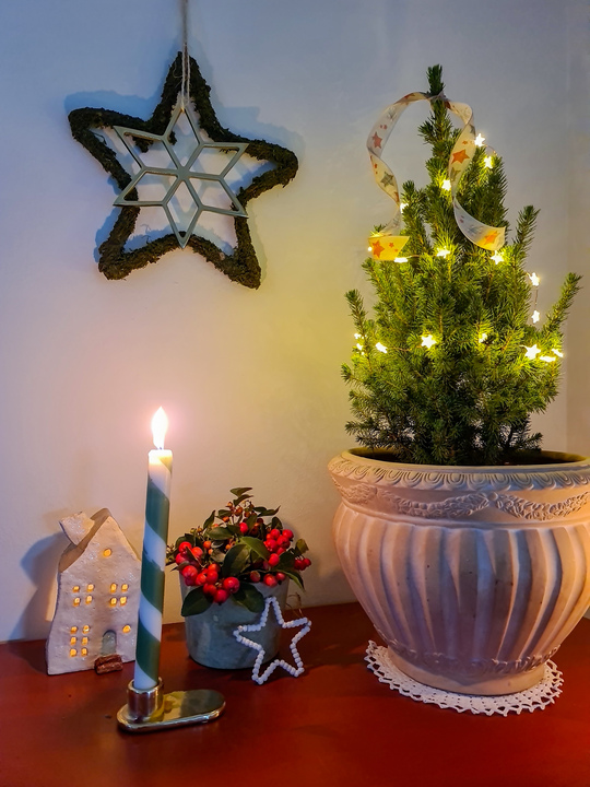 Wanneer Sinterklaas is vertrokken, haal ik de kaneelstokjes er weer uit (die kunnen daarna nog hup! in de stoofperen voor het kerstdiner). En met een lichtsnoertje en wat kleine kerstversieringen, is hetzelfde sparretje ineens een echt kerstboompje geworden! Gecombineerd met de rode bessen van de Gaultheria Procumbens (Bergthee) is het een warm, winters geheel geworden.