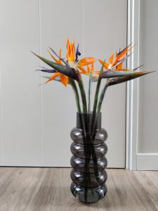 Hieronder deel ik een foto van de Paradijsvogelbloemen in mijn antraciet vaas. Je ziet dat het een mooi effect geeft wanneer je er vijf bij elkaar zet. Echter kan de bloem gerust ook alleen, of samen met een mooi blad, in een grote fles gezet worden. Ze stelen toch wel de show 😉