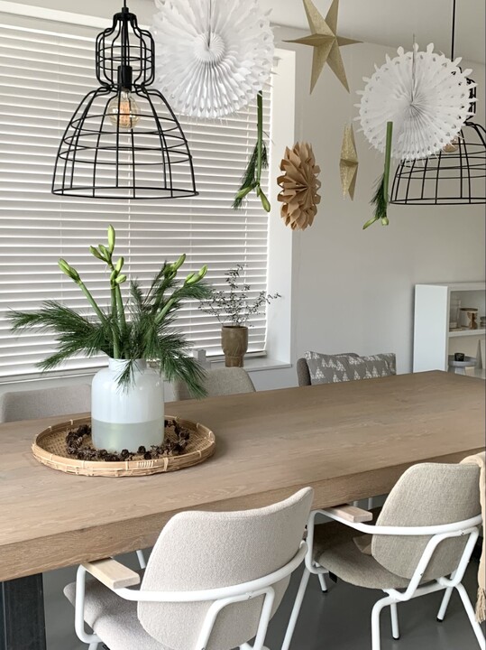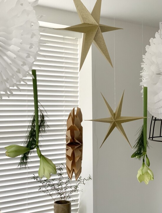 Ik begon deze blog met de titel Hang up! Wist jij dat je een Amaryllis ook op z’n kop kan laten bloeien? Het is heel eenvoudig en het geeft een leuk en feestelijk sfeertje. Wel hebben de bloemen water nodig dit giet je heel gemakkelijk in de holle steel. Voor de feestdagen heb ik onze keuken alvast gezellig in kerstsfeer gebracht! En met de hangende bloemen is ook de kersttafel helemaal af. De andere Amaryllissen heb ik in een mooie grote vaas gezet gecombineerd met een paar Pinus takken.