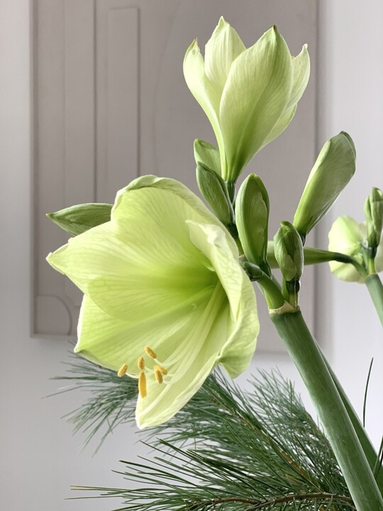 De Amaryllis komt van oorsprong uit de narcisfamilie en is er in vele soorten en kleuren. Ik mocht bij bloemisterij Fleurina deze mooie mini variant ophalen. Ze staan en hangen nu bijna een week in huis en de eerste bloemen beginnen mooi te bloeien.