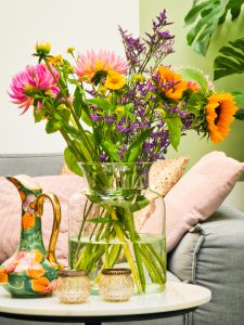 Het boeket staat nu al een week in huis. Misschien vraag je je af of dit boeket er na een week nog steeds zo kleurrijk bij staat? Mijn antwoord is jazeker! Je hebt net kunnen lezen dat een Dahlia niet veel langer mee gaat als 4 tot 5 dagen. Deze heb ik daarom gisteren verwijdert uit het boeket en de overige bloemen hebben een nieuw leven gekregen. Hier onder lees je welke tips ik heb om langer plezier te hebben van je bos bloemen.