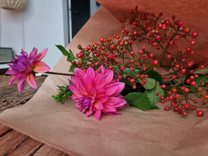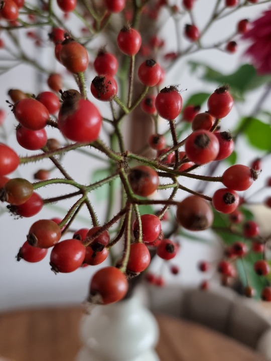 Wat deze rozenbottel tak dan even wat extra’s geeft is deze Dahlia. Deze Dahlia in mooie herfst kleur past perfect bij de mooie rode rozenbottel. Samen staan ze mooi in de vaas. Simplicity kan mooi zijn met 2 enkele takken dus.