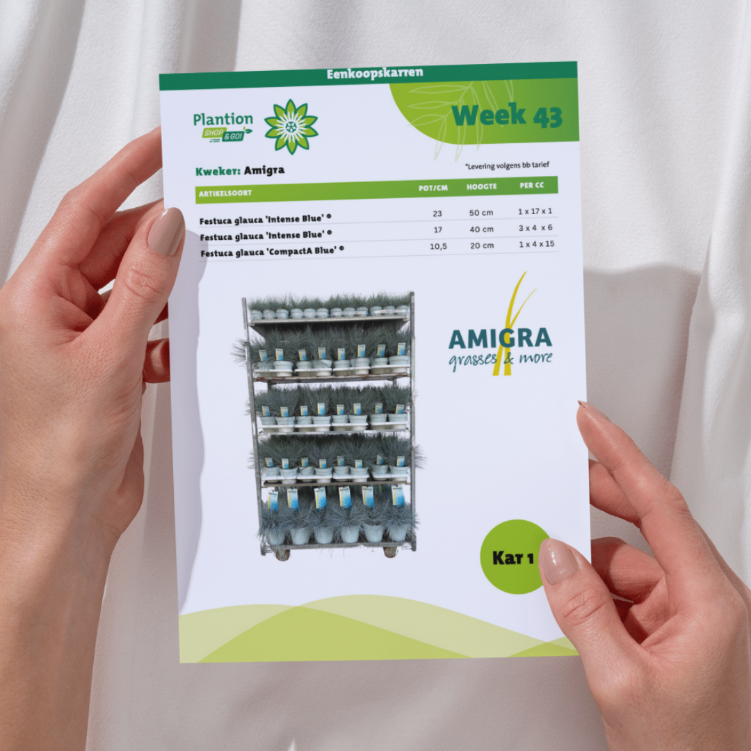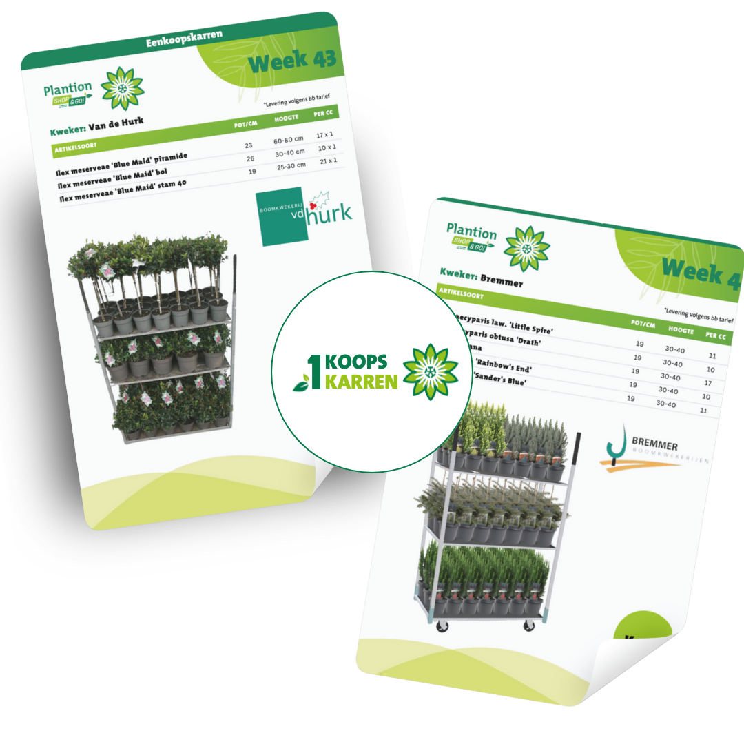 • Éénkoopskarren: met de éénkoopskarren bestel je eenvoudig op één plek een volledig assortiment om je plantentafels te vullen, met wekelijks een speciaal geselecteerd aanbod planten.