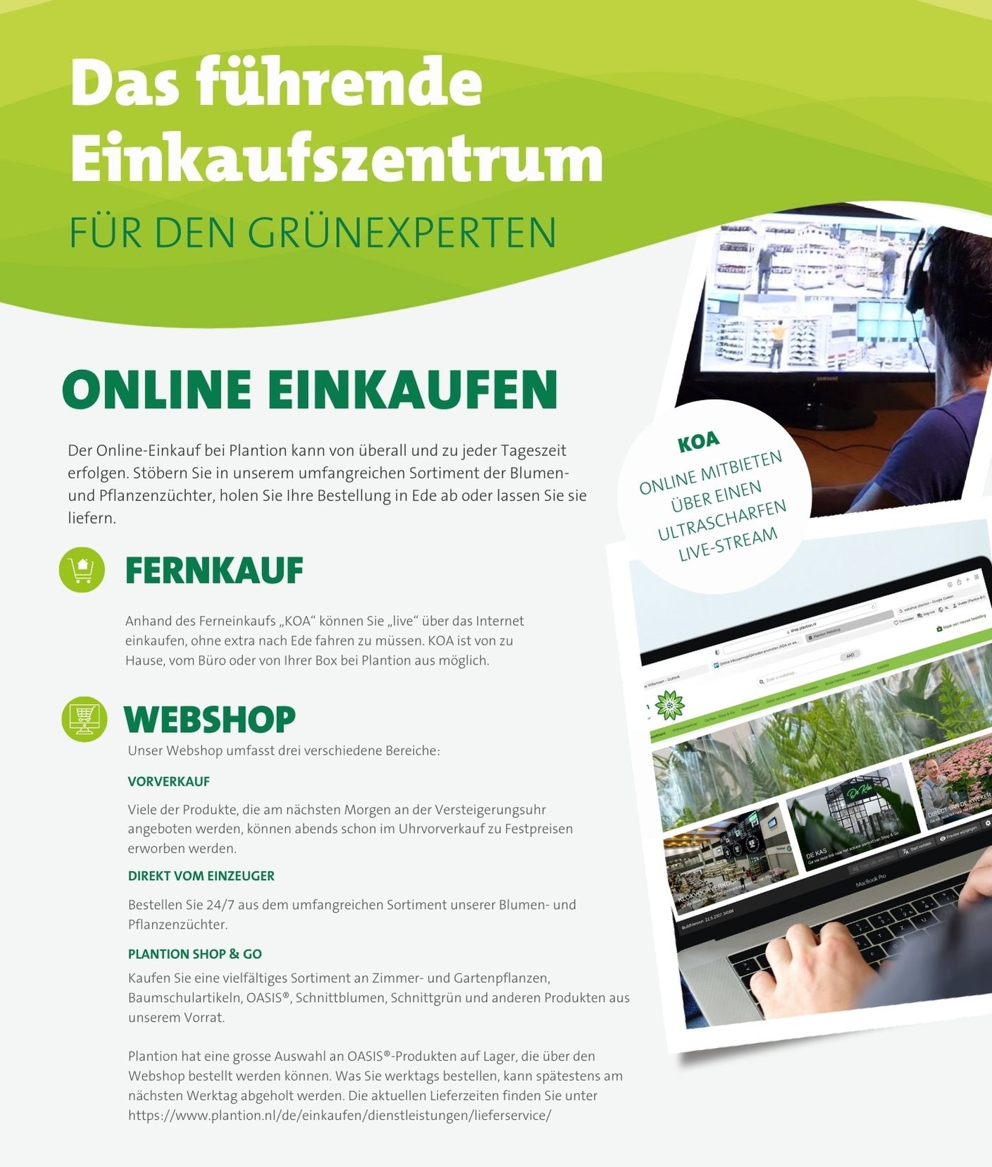 Verbundenheit bei der Digitalisierung – Möchten Sie die Vorteile des Online-Einkaufs Ihrer Blumen und Pflanzen nutzen? Plantion bietet Ihnen verschiedene Möglichkeiten, darunter den Fernkauf (KOA) und des Webshop. Plantion bietet auch die Möglichkeit, sich die Produkte vor dem Versteigerungsprozess beim Uhrvorverkauf anzusehen.
