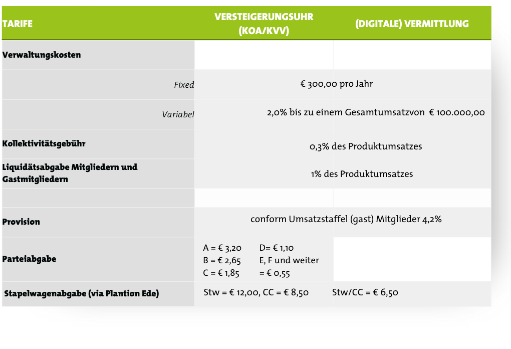 Verbindend in Zahlen – Die verschiedenen Dienstleistungen von Plantion werden in Rechnung gestellt. Die wichtigsten Preise werden jährlich auf der Generalversammlung der Genossenschaft festgelegt. Alle Preise für Zulieferer stehen hier unten.