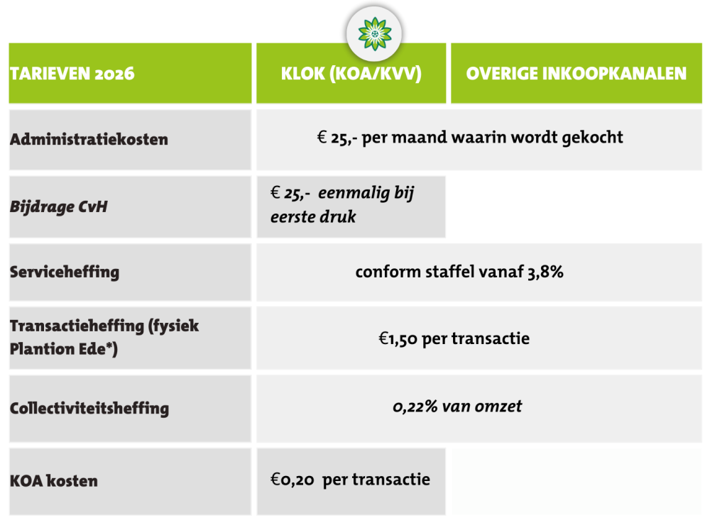 Over de gekochte productomzet bij klok en bemiddeling wordt 0,22% aan collectiviteitsheffing ingehouden. Deze gelden worden aangewend voor het ondersteunen van consumentenmarketing, bijdrages aan brancheverenigingen en sector gerelateerde kosten.